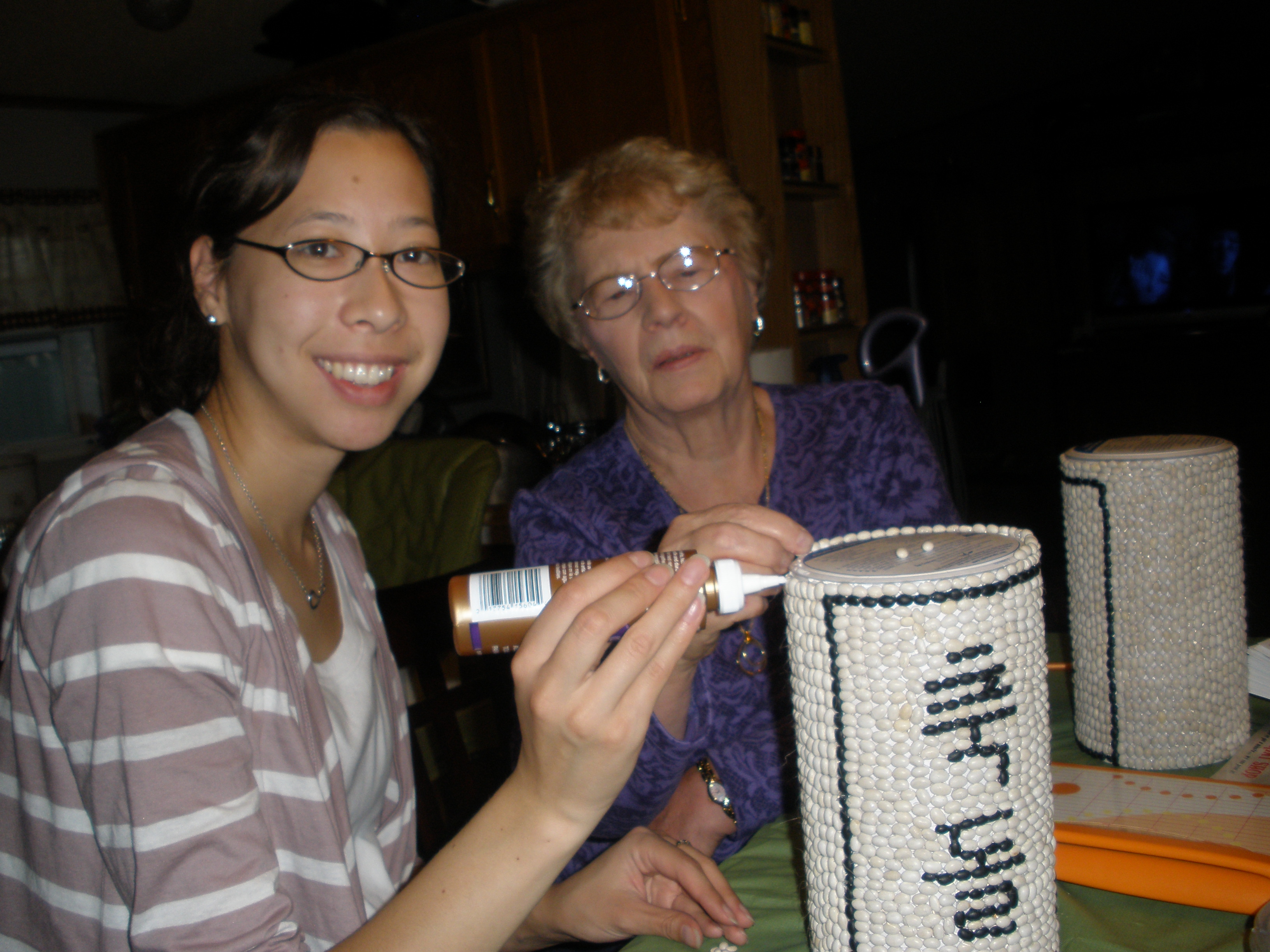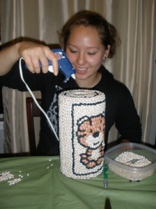 Here is my sister hot gluing beans to an oatmeal cannister masterfully hand-crafting a Dol tower.