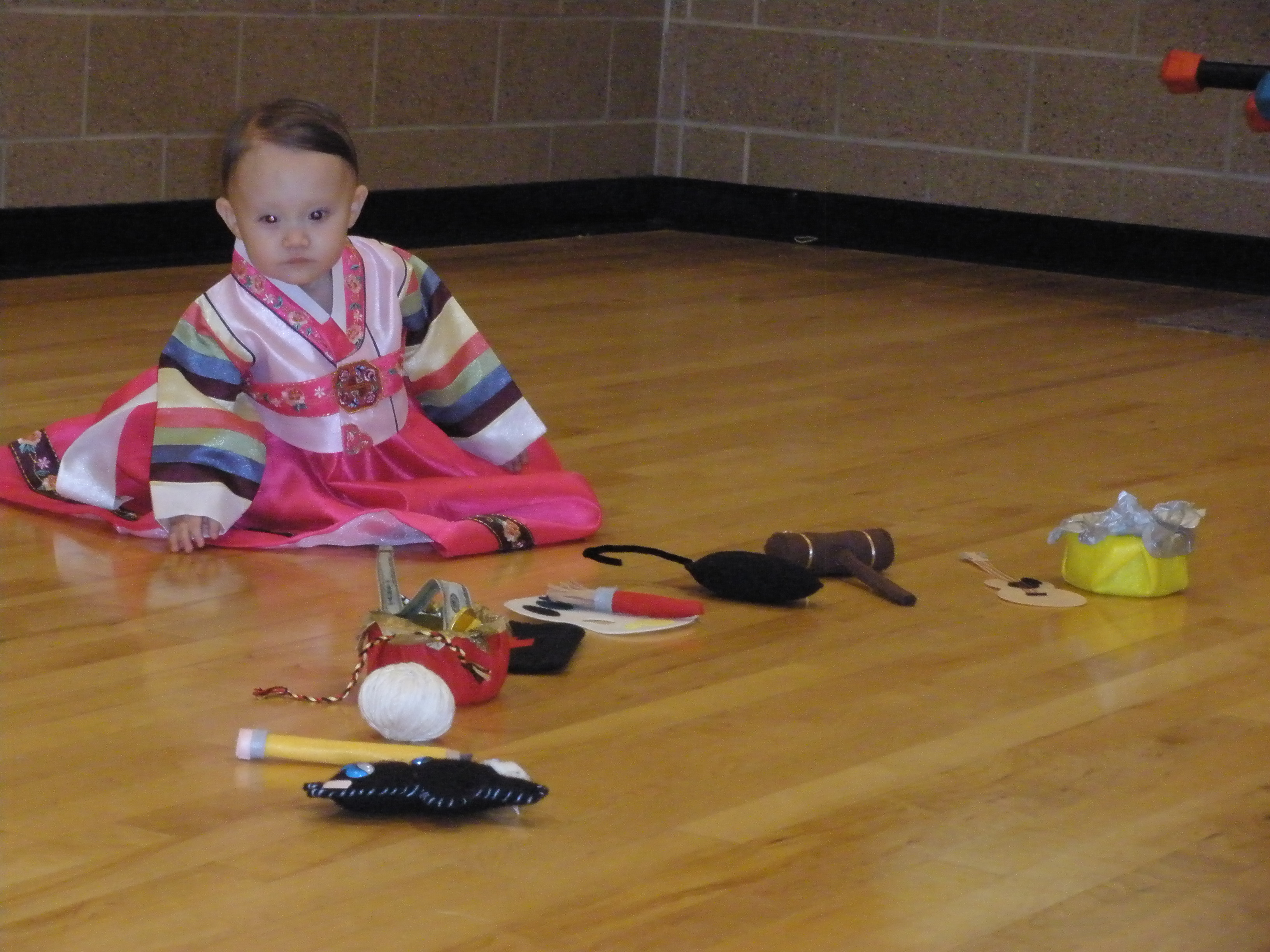 The Doljabi is a “game” *coughritualcough* where the innocent and unsuspecting little one is forced to choose his/her life destiny before a large audience of friends and family.  If the average American teen thinks it’s a lot of pressure to decide at 18… try being a Korean-American 1 year-old!